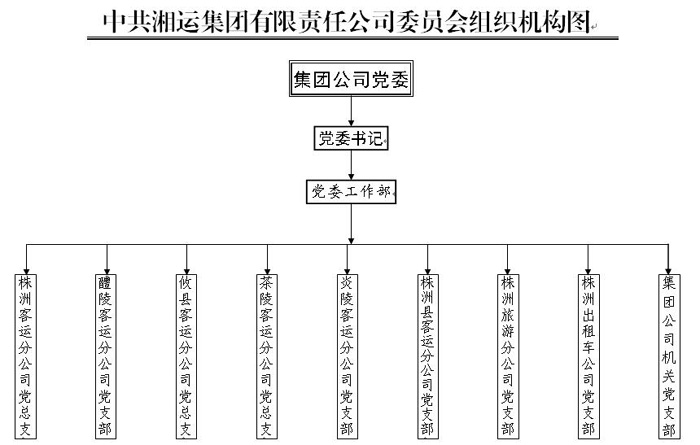 中共湘運集團有限責任公司委員會,隸屬于中共株洲市非公有制經(jīng)濟組織工委。黨委會常設工作機構黨委工作部。全司共有中共黨員304名。下轄株洲客運分公司黨總支、醴陵客運分公司黨支部、攸縣客運分公司黨總支、茶陵客運分公司黨總支、炎陵客運分公司黨支部、株洲縣客運分公司黨支部、株洲旅游分公司黨支部、株洲出租車公司黨支部、集團公司機關黨支部共9個二級基層黨組織。